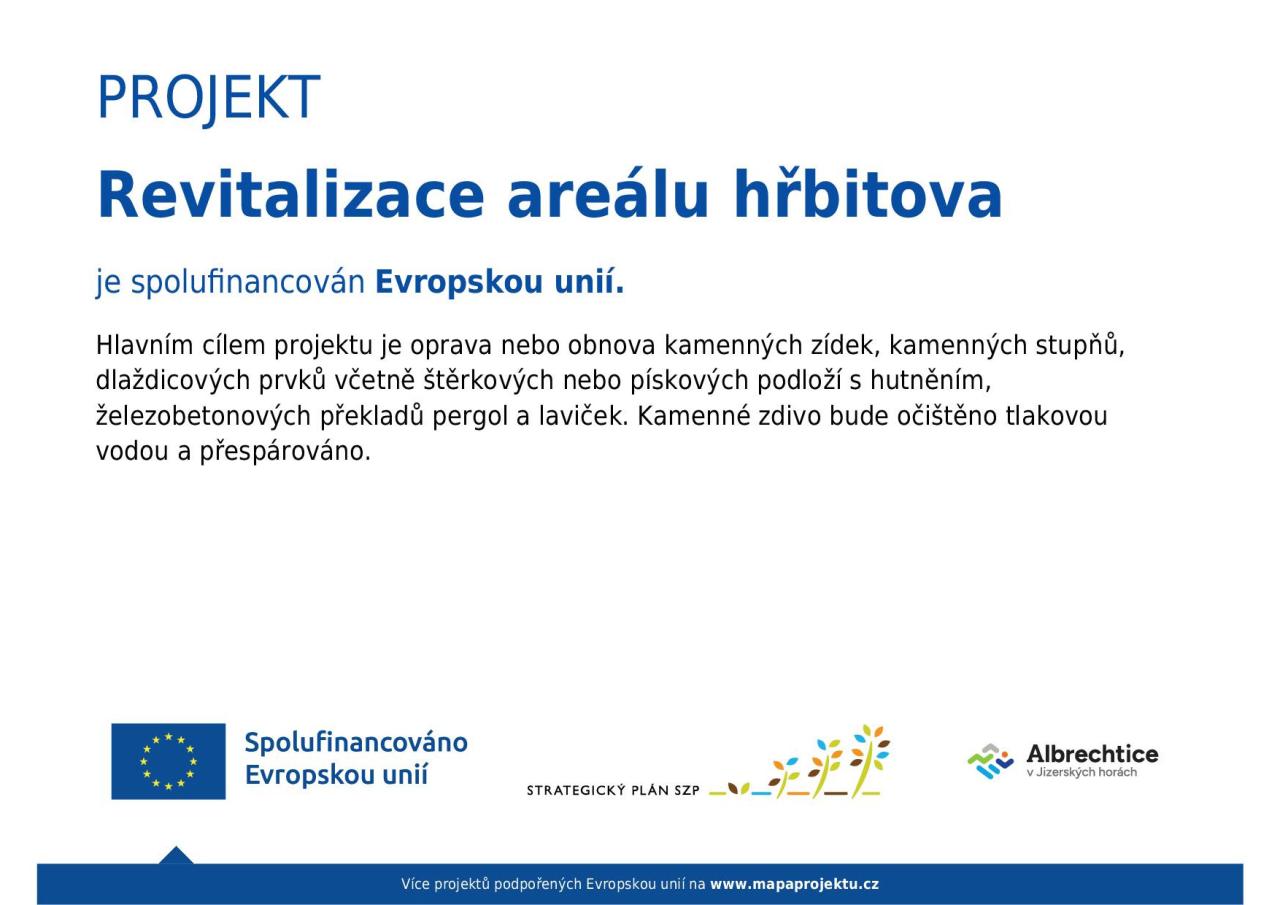 Od letošního roku do podzimu roku 2026 bude probíhat oprava areálu hřbitova. V rámci projektu bude provedena oprava nebo obnova kamenných prvků a dlaždic, pergol a laviček. Projekt je spolufinancován Evropskou unií i národní dotací. Návštěvníky hřbitova prosíme o shovívavost.