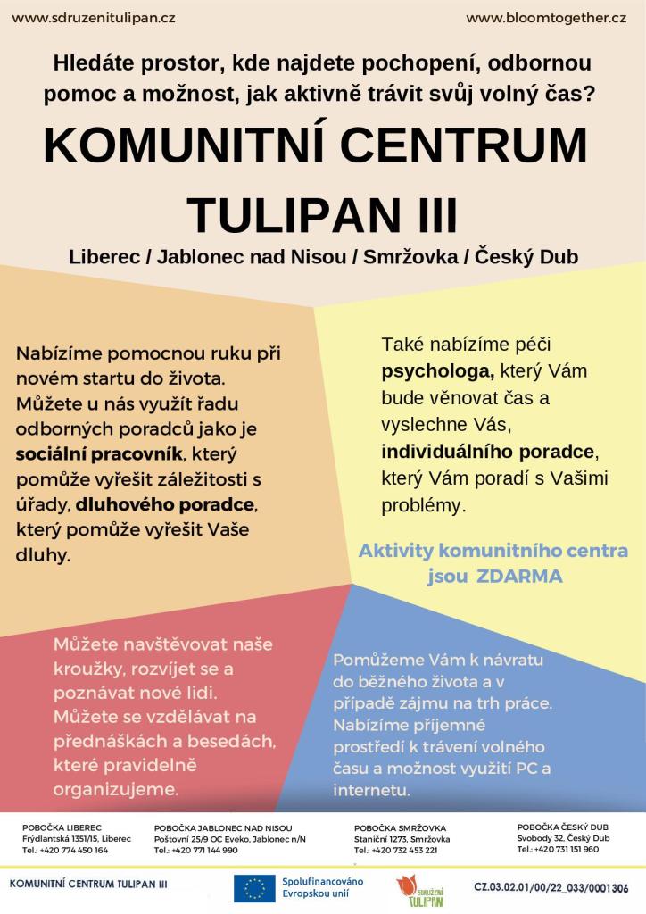 Ocitli jste se v duševní tísni, trpíte úzkostmi nebo máte diagnostikovanou nějakou formu duševního onemocnění? Vychováváte dítě, které trápí psychické problémy a má potíže ve škole? Potřebujete překonat nepříznivou sociální situaci? Pečujete o zdravotně postiženého člena rodiny? Máte zdravotní znevýhodnění nebo příliš nízkou kvalifikaci a nemůžete najít práci? S tím vším vám může pomoci Sdružení TULIPAN, které v lednu zprovoznilo své komunitní centrum ve Smržovce.